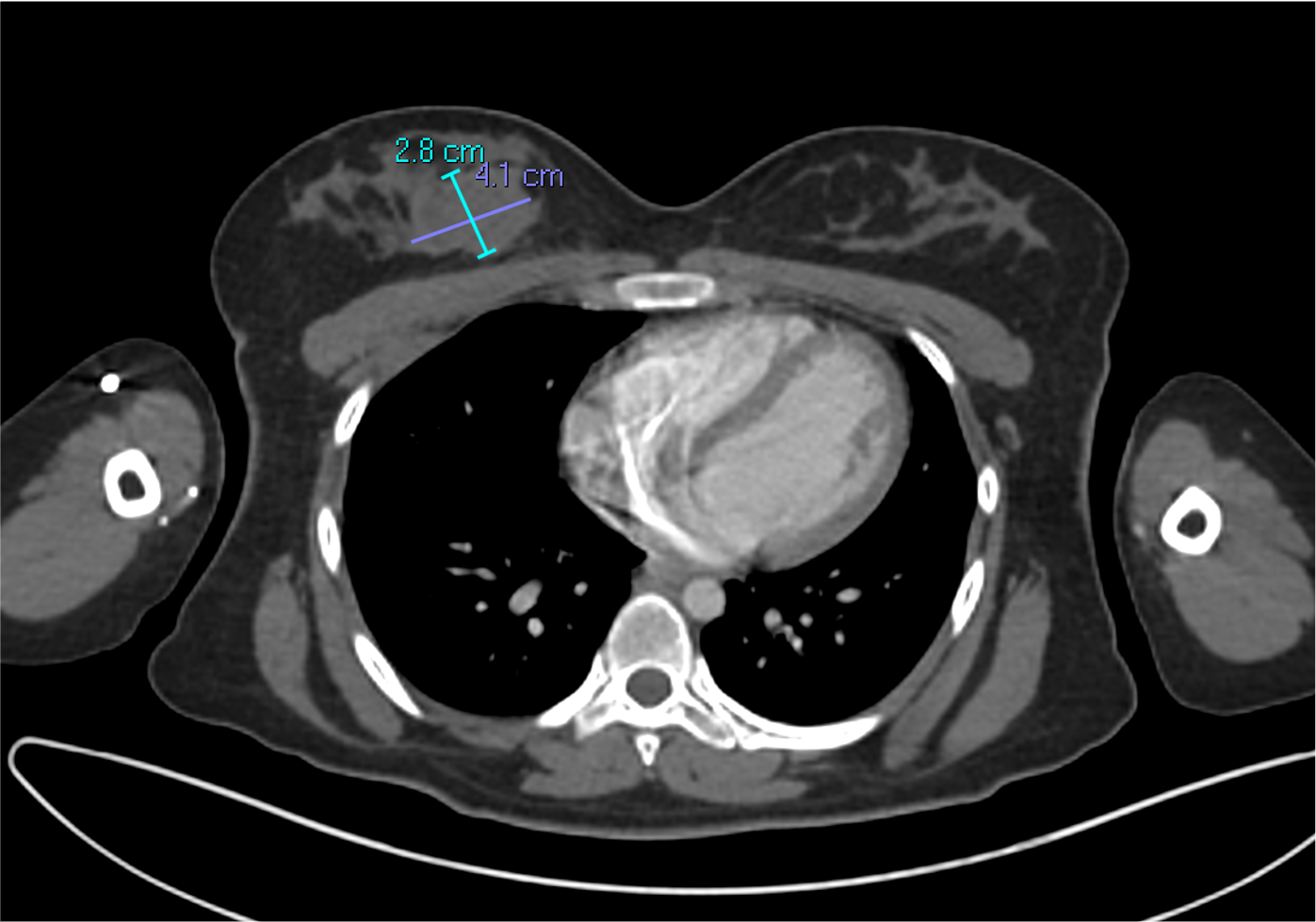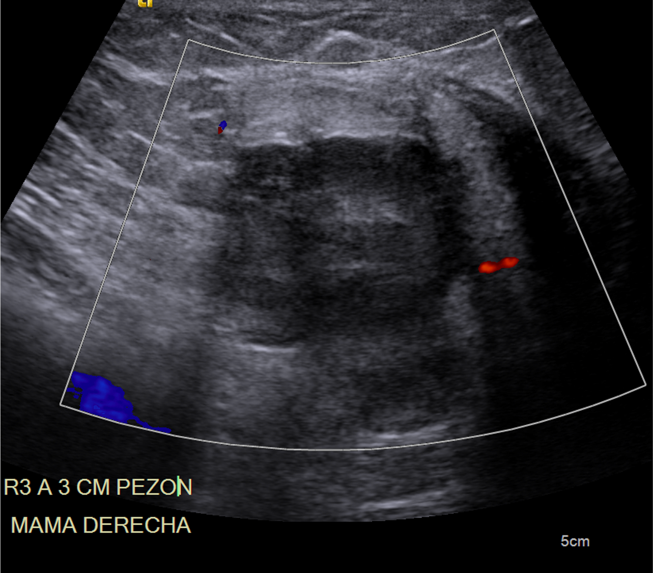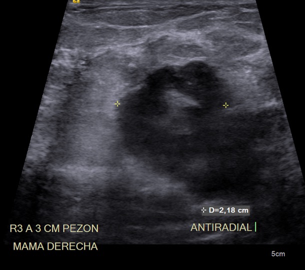 F. Mama derecha heterogénea, por la presencia de nódulo de composición sólida, homogénea, con realce periférico tras la administración de medio de contraste, localizado hacia cuadrantes internos y medidas aproximadas de 28×41 mm.