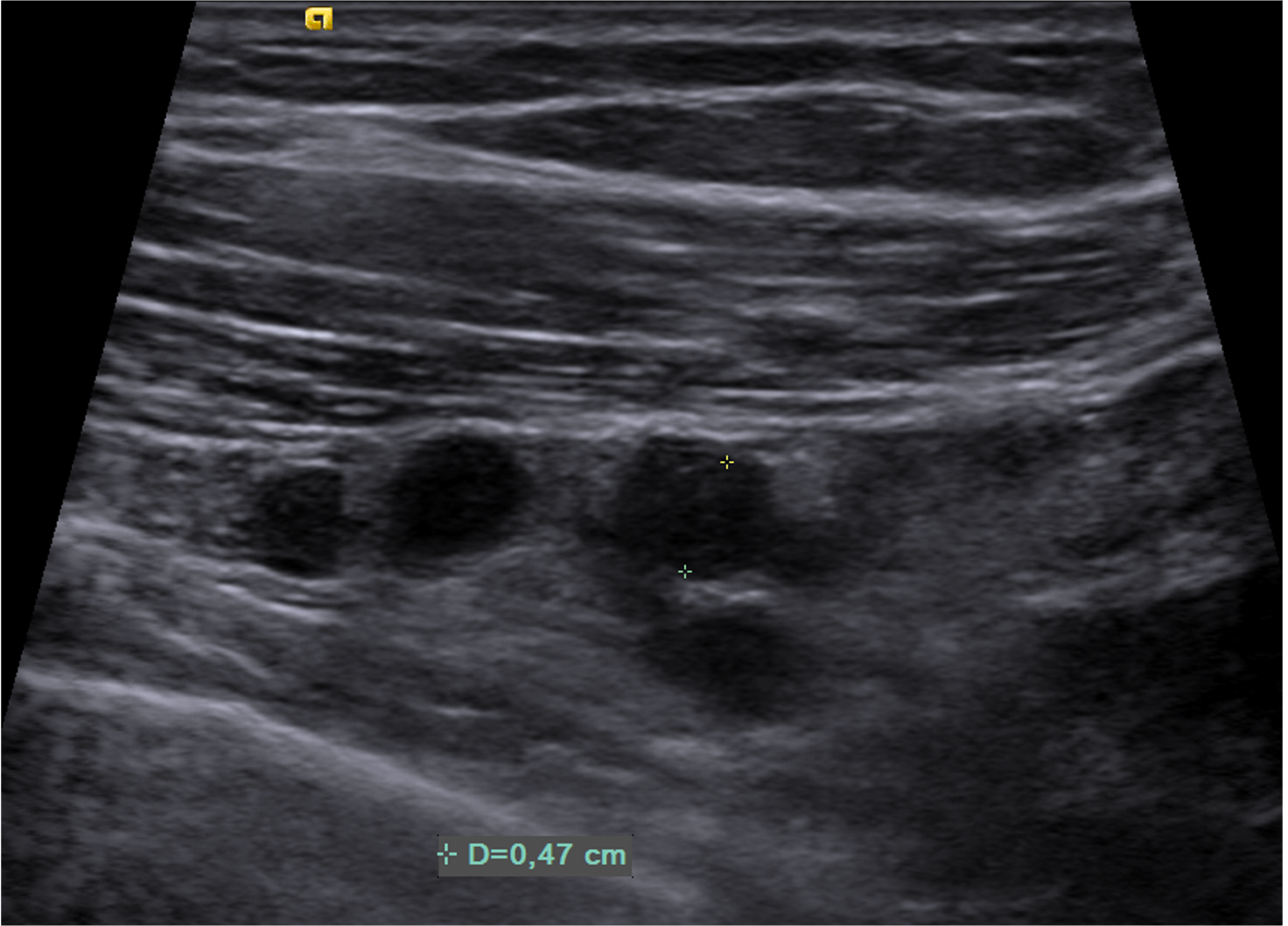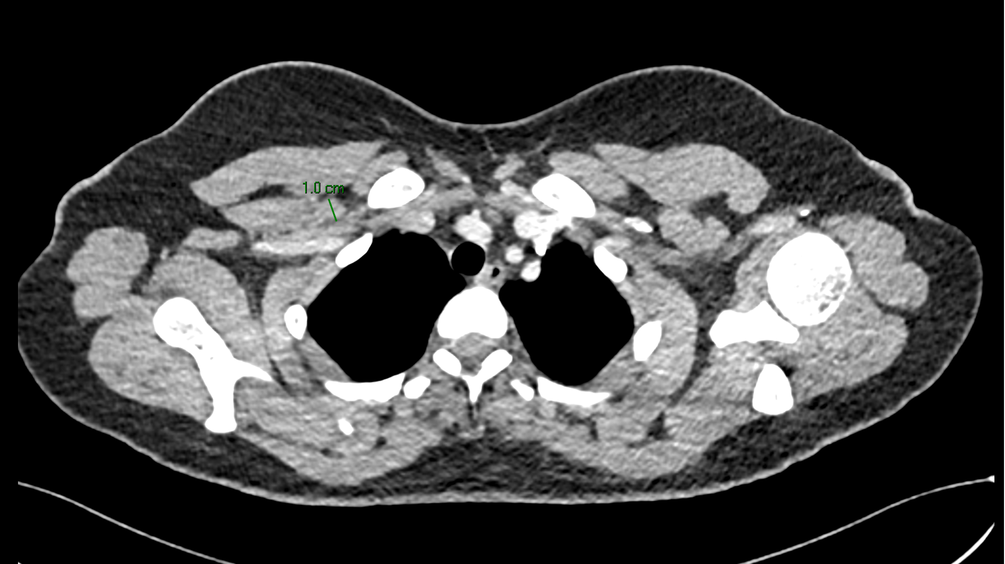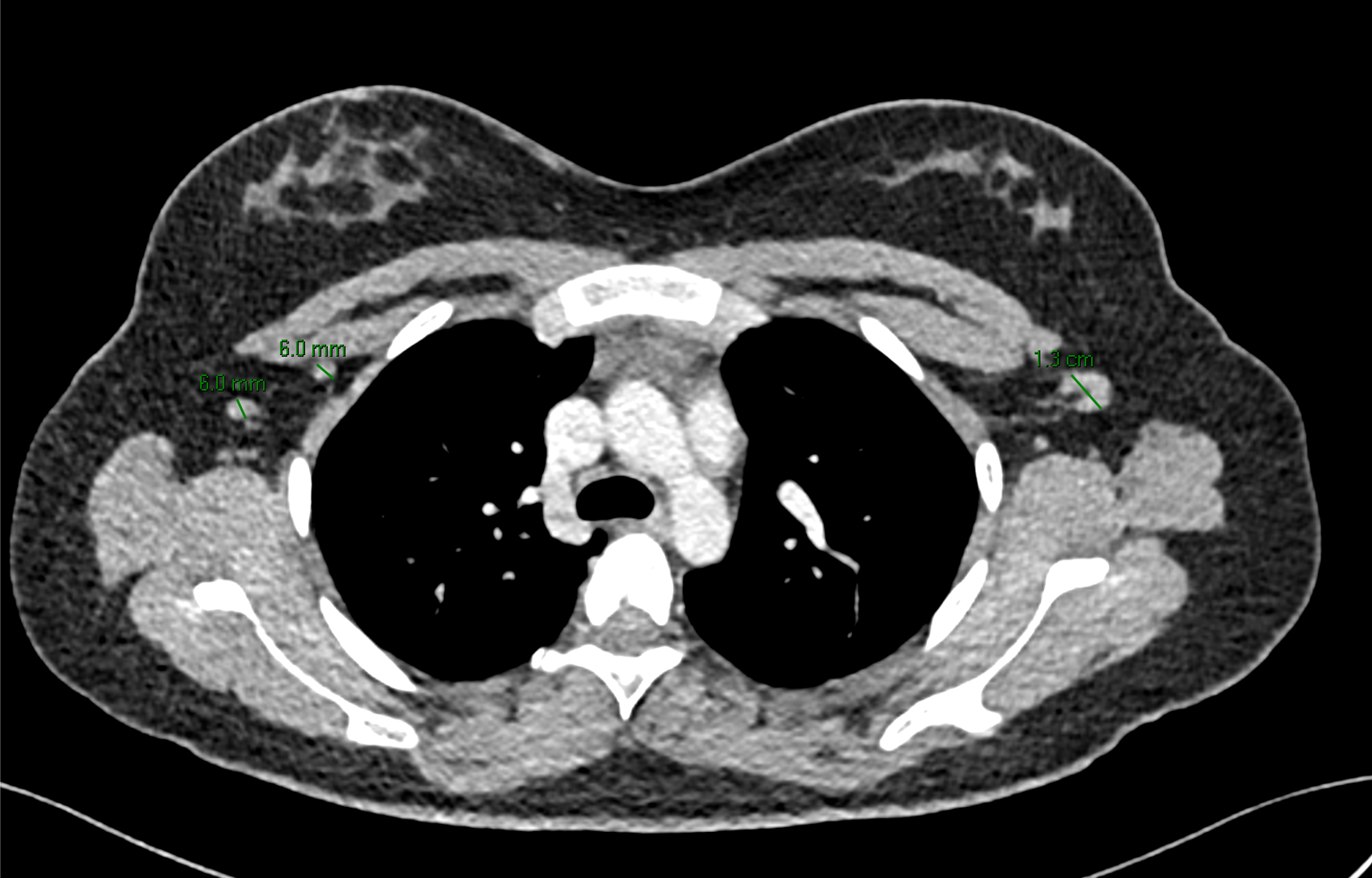 K. Región axila derecha con presencia de múltiples ganglios de morfología ovoidea, con pérdida de su hilio graso central y eje corto de hasta 6 mm. Región axilar izquierda con ganglio que conserva morfología, hilio graso con eje corto de hasta 13 mm.