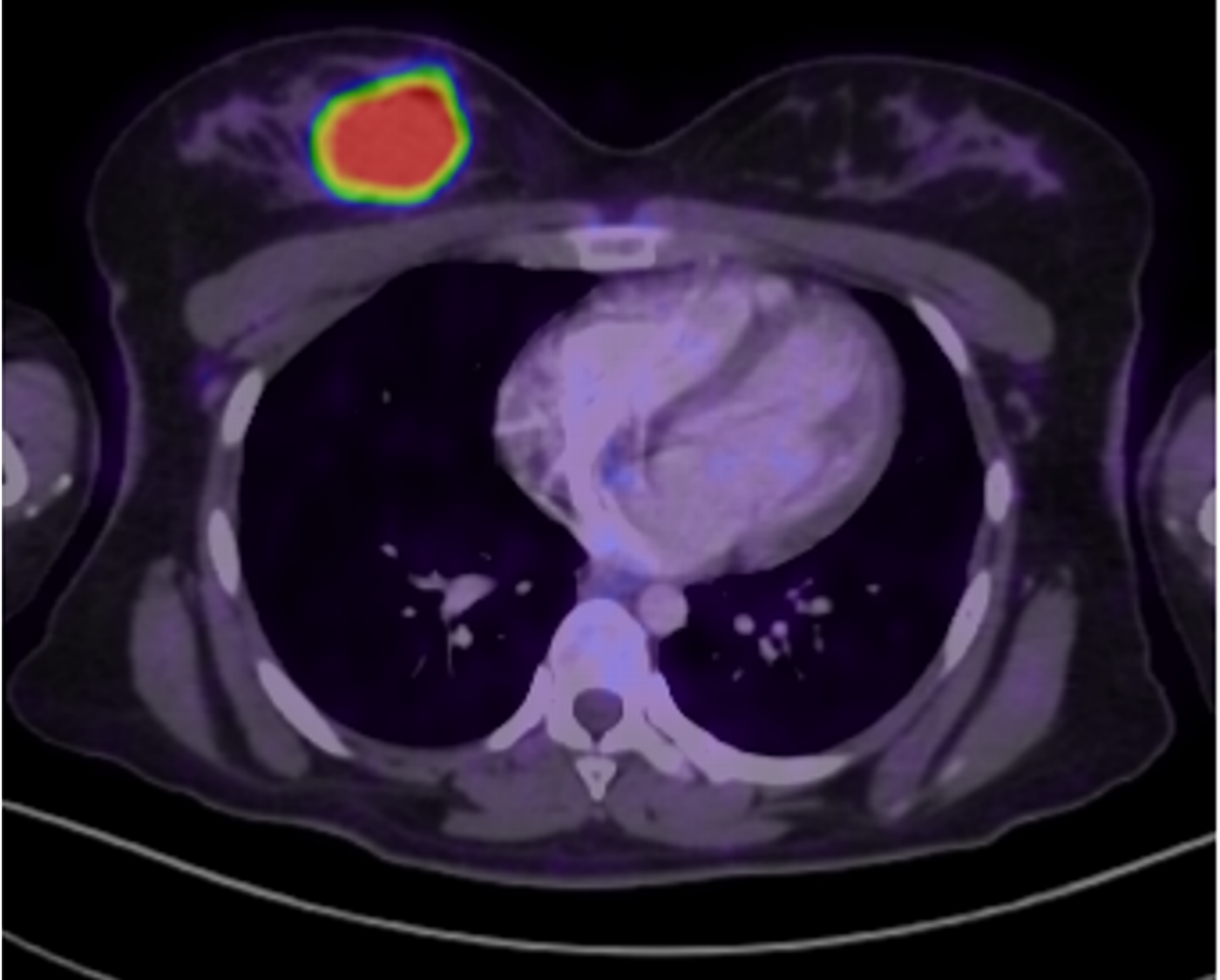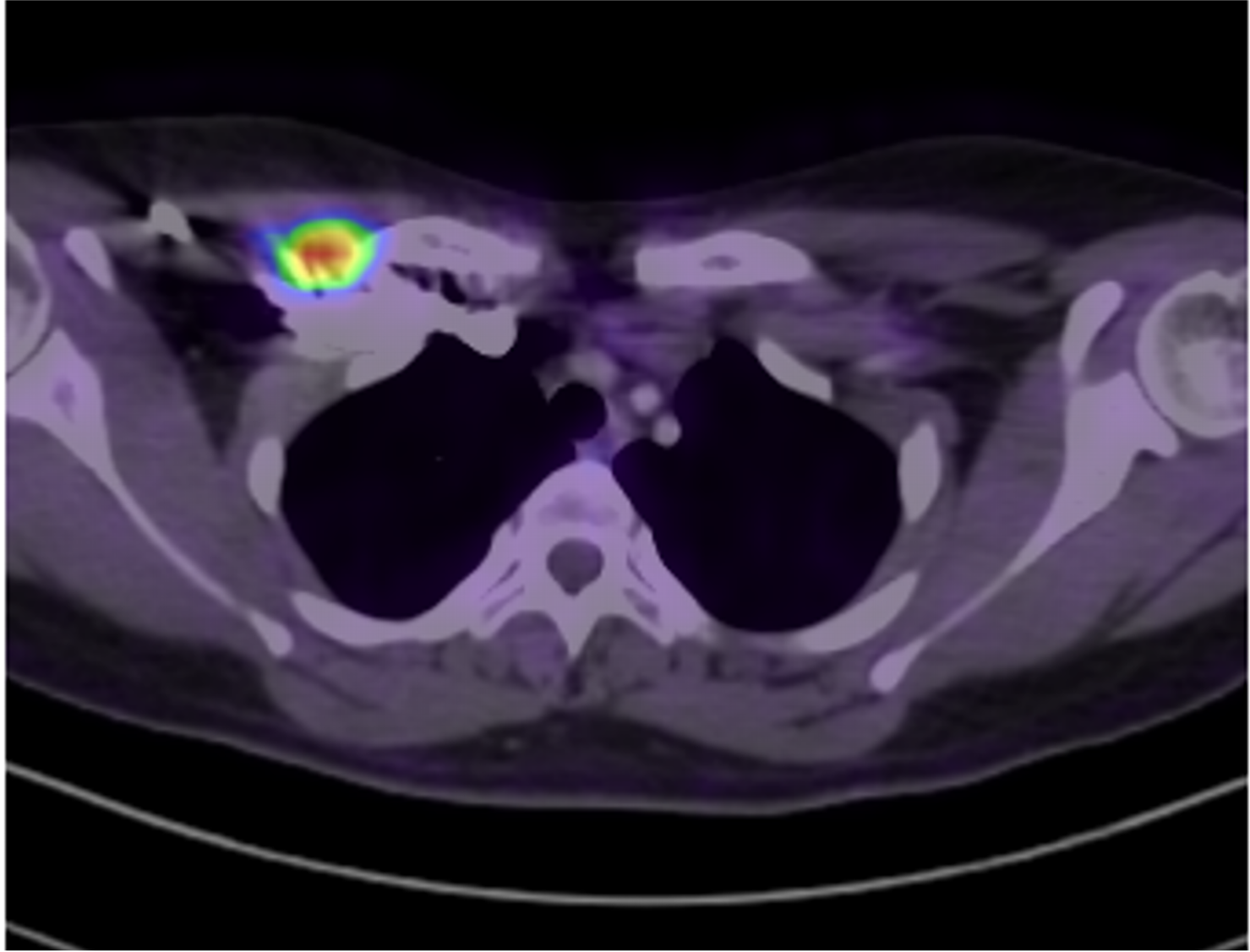 G. Imagen de PET CT a nivel de mama derecha identificando lesión sólida visualizada por tomografía, asociada a hipermetabolismo.